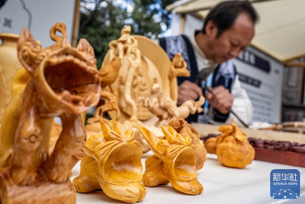 ↑ 11月23日,剑川木雕省级传承人杨焕培在2025非遗品牌推广周上制作木雕。