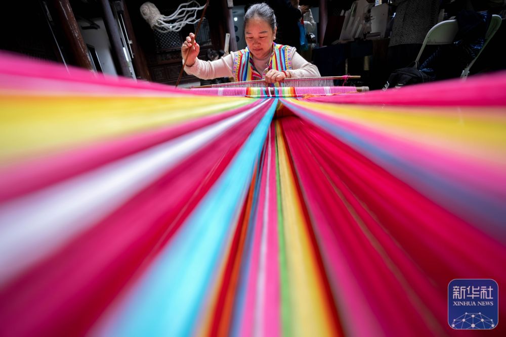 ↑ 11月23日,独龙毯制作技艺展台的工作人员在2025非遗品牌推广周上制作独龙毯。
