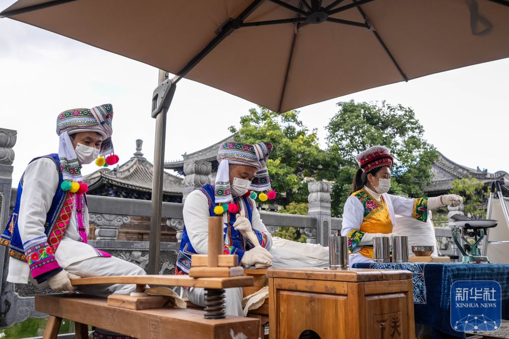 ↑ 11月23日,下关沱茶制作技艺展台的工作人员在2025非遗品牌推广周上制作沱茶。